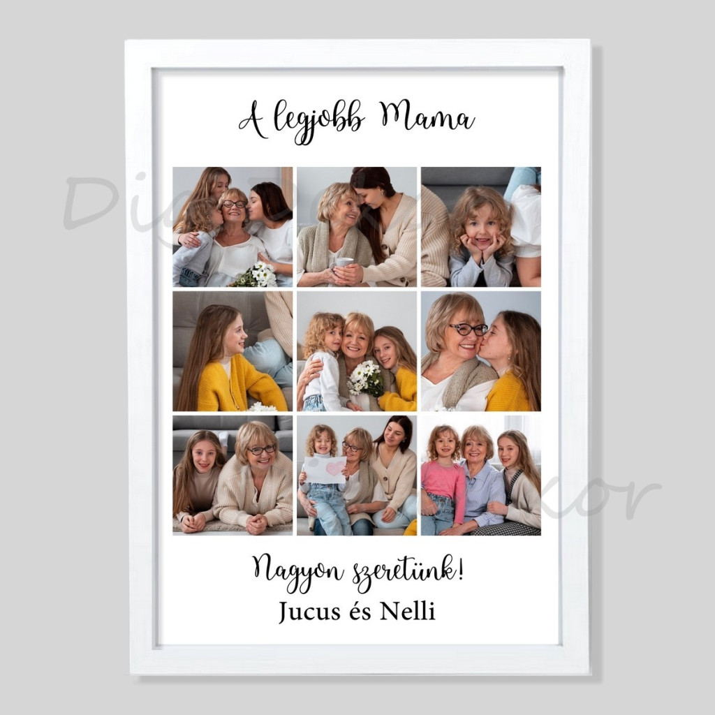 Egyedi fotómontázs 9 darab négyzet alakú képpel, az általad kért felirattal. Hangulatos, személyes falikép anyák napjára, születésnapra, karácsonyra.
